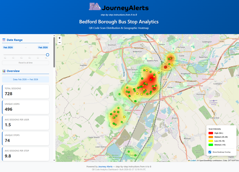 Bedford Borough Bus Stop Analytics: QRCode Heatmap